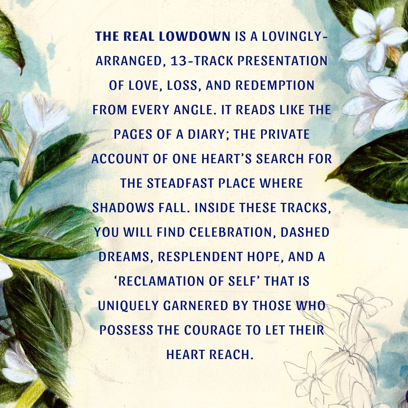 The Real Lowdown is a lovingly-arranged, 13-track presentation of love, loss, and reclamation from every angle. It reads like the pages of a diary - the private account of one capricious heart’s search for the steadfast place where shadows fall. Inside these tracks, you’ll find resplendent joy, dashed dreams, and a steadfast ‘reclamation of self’ that is uniquely garnered by those who possess the courage to let their heart reach.